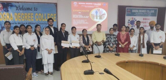 The Equal Opportunity Cell of Dogra Degree College (Autonomous), successfully organized a thought-provoking symposium titled “Swaraj Bharat for All: Men and Women as Equal Pillars of Nation-Building.” The event witnessed enthusiastic participation from students ofManagement, Law, Humanities, and Commerce departments, fostering a spirit of dialogue and inclusivity. The program commenced with a cordial welcome address by Ms. Amarpreet Kaur, which set an engaging and motivational tone for the proceedings. The event was meticulously coordinated by Ms. Monika, Convenor of the Equal Opportunity Cell, under the guidance of Dr. Bela Thakur, Principal, Dogra Degree College, and with the support of Mr. Rakesh Mohan Koul, Head of Department BBA & B.Com. The symposium featured interactive sessions and insightful discussions focusing on gender equality, leadership, and social responsibility. Speakers underscored the vital roles of both men and women in shaping a progressive and inclusive India, reinforcing the importance of equal participation in nation-building.