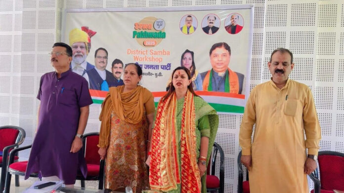 Rekha Mahajan was warmly welcomed by enthusiastic party workers as she addressed a workshop organized at the BJP District Office Samba. The programme was held under the presidentship of District President Asha Rani, and attended by senior leaders including State Vice President Rashpal Verma, Sangathan Mantri Inderjeet Sharma, District General Secretaries Amit Dubey and Rakesh Pinta, besides Mandal Presidents, office bearers, convenors, and co-convenors of the programme.