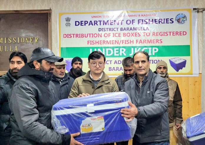 In a step towards strengthening the fisheries sector, Deputy Commissioner Baramulla, Minga Sherpa, in presence of Assistant Director Fisheries, today distributed 94 ice boxes among registered fishermen and fish farmers of the district.